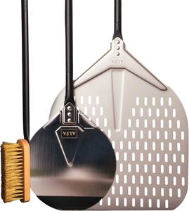 A perforated aluminum pizza peel to launch the pizza easily while letting excess flour fall from the surface